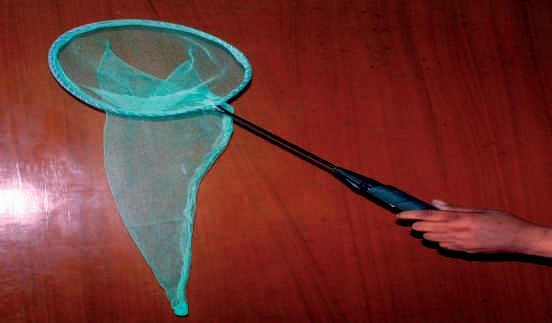 Butterflies are one of the most active insects that do not remain stable and keep moving here and there. Hence it becomes difficult for a person to observe butterflies at one place for more than few seconds. One is forced to chase them continuously to observe their behavior. Butterfly net is a useful tool to catch butterflies and observe them for the required time without doing harm to them. The butterfly net consists of a metallic or wooden handle with removable or fixed rugged metallic ring or wire hoop. An elongated mesh bag (usually made of nylon) is attached to the ring in a manner that its broad mouth is fixed to the ring/hoop and the elongated part ends in a narrowing closed distal end. To catch the butterfly the net is swung in the air such that the flying butterfly is caught in the mesh bag without causing any harm to its body.