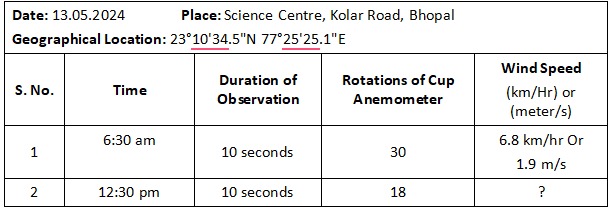 Table for recording the wind speed for different durations -