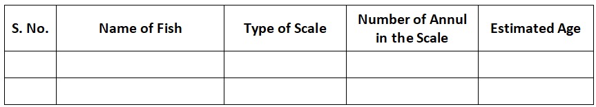 ● Record of Scale type and annuli rings count – A data table can be designed for recording the scale types and the number of annual rings formed in them. Here and example of data table is given -