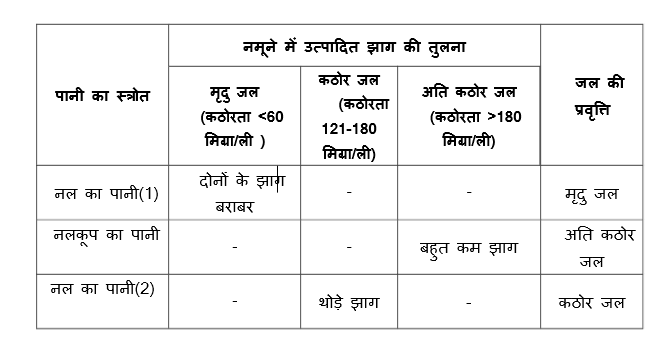 उत्पादित झाग के अवलोकन के आधार पर विभिन्न पानी के नमूनों की कठोरता का तुलनात्मक परिमाण लिखें। विभिन्न स्त्रोतों के पानी के नमूनों की कठोरता का एक आंकड़ा संग्रह तैयार करें।