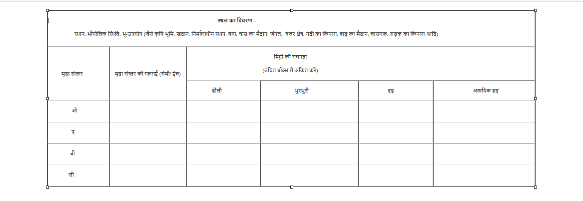 ● नमूना स्थल के आसपास के परिदृश्य के छायाचित्र आगे संदर्भ में उपयोगी होंगे।