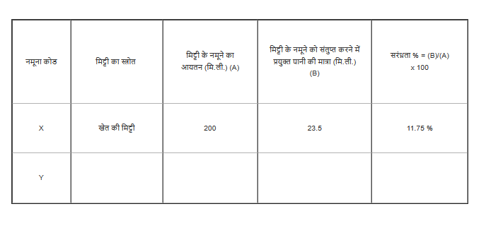 ● मिट्टी के विभिन्न नमूनों को संतृप्त करने में प्रयुक्त पानी की मात्रा को आंकड़ा तालिका में रिकॉर्ड करें।
