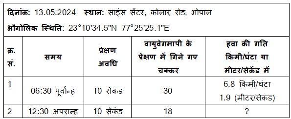 एक दिन में विभिन्न अवधियों के लिए दर्ज की गई हवा के वेग को दर्शाने हेतु तालिका -