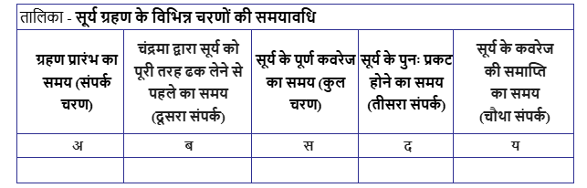 ● ग्रहण के चरणों को सारणीबद्ध रूप में दर्ज किया जा सकता है। उदाहरणार्थ एक नमूना तालिका यहाँ दर्शाई जा रही है, आप अपनी आवश्यकतानुसार आंकड़ा तालिका बना सकते हैं।