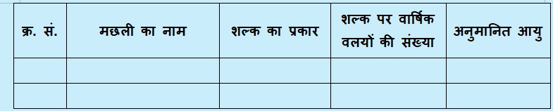 ● मछलियों, उनके शल्कों का स्वरूप, शल्क संरचना, वार्षिक वलय स्वरूप इत्यादि के फोटो या हस्तनिर्मित रेखाचित्र प्रभावी बन सकते हैं।
