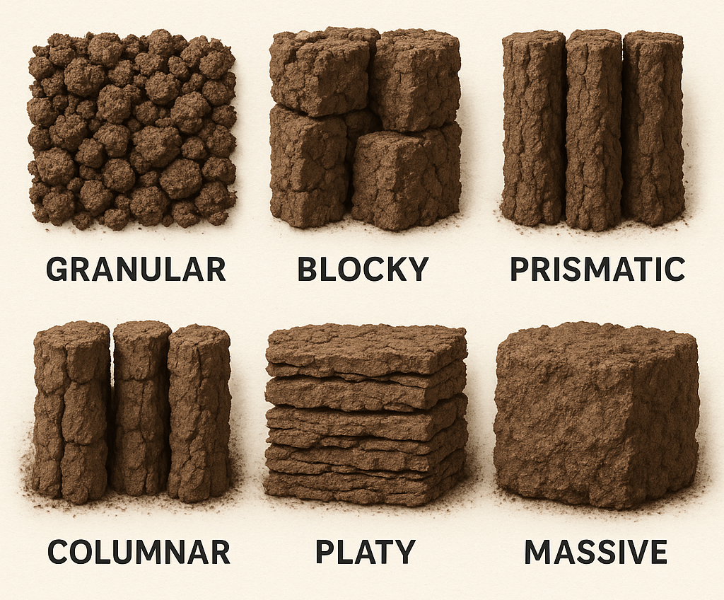 Soil structure is the shape that the soil takes based on the arrangement of the solid parts and the pore spaces located between them. In other words it is the assemblage of the sand, silt and clay appearing in varying size of larger particles that are called aggregates. Soil structure is described in terms of grade (degree of aggregation), class (average size) and type (form or shape of individual aggregates). Five distinct classes (based on average size of individual aggregates) of soil structure are very fine, fine, medium, coarse and very coarse. The soil structure plays important role in moisture and water holding capacity of the soil as well as holding and leaching of inorganic and organic compounds in soil horizons.