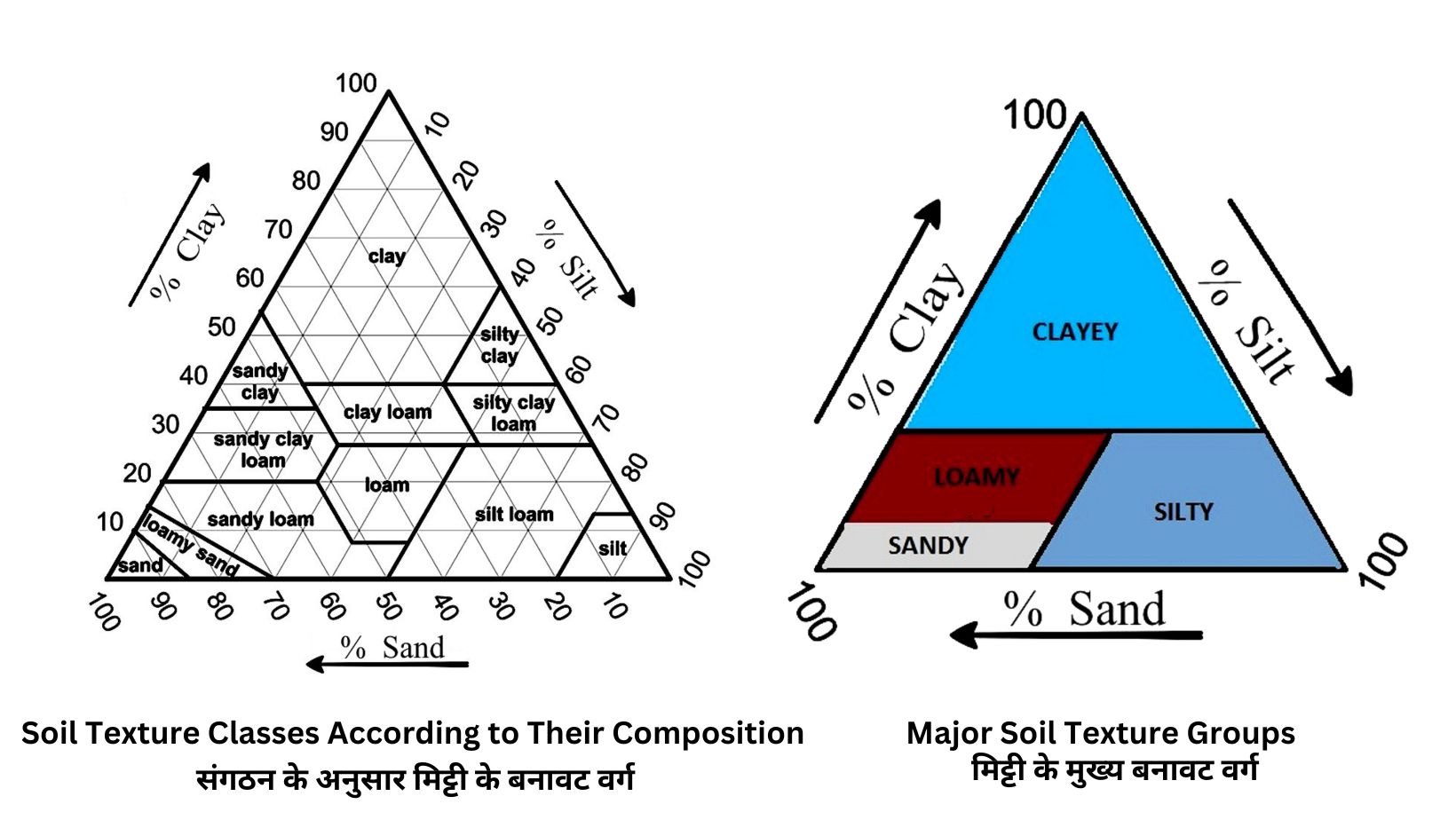 Soil texture is classified in various types according to the composition of differently sized particles. Major classes are Sandy, Loam, Clay, Loamy Sand (Silt), Sandy Loam, Silty Loam, Sandy Clay Loam, Silty Clay Loam, Clay Loam, Sandy Clay and Silty Clay.