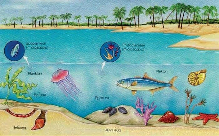 * Epibenthos: Those spend their lives attached to the bottom floor on rocks, or on shells etc. e.g. Corals, Sponges, Barnacles, Macroalgae, Sea Grasses etc.