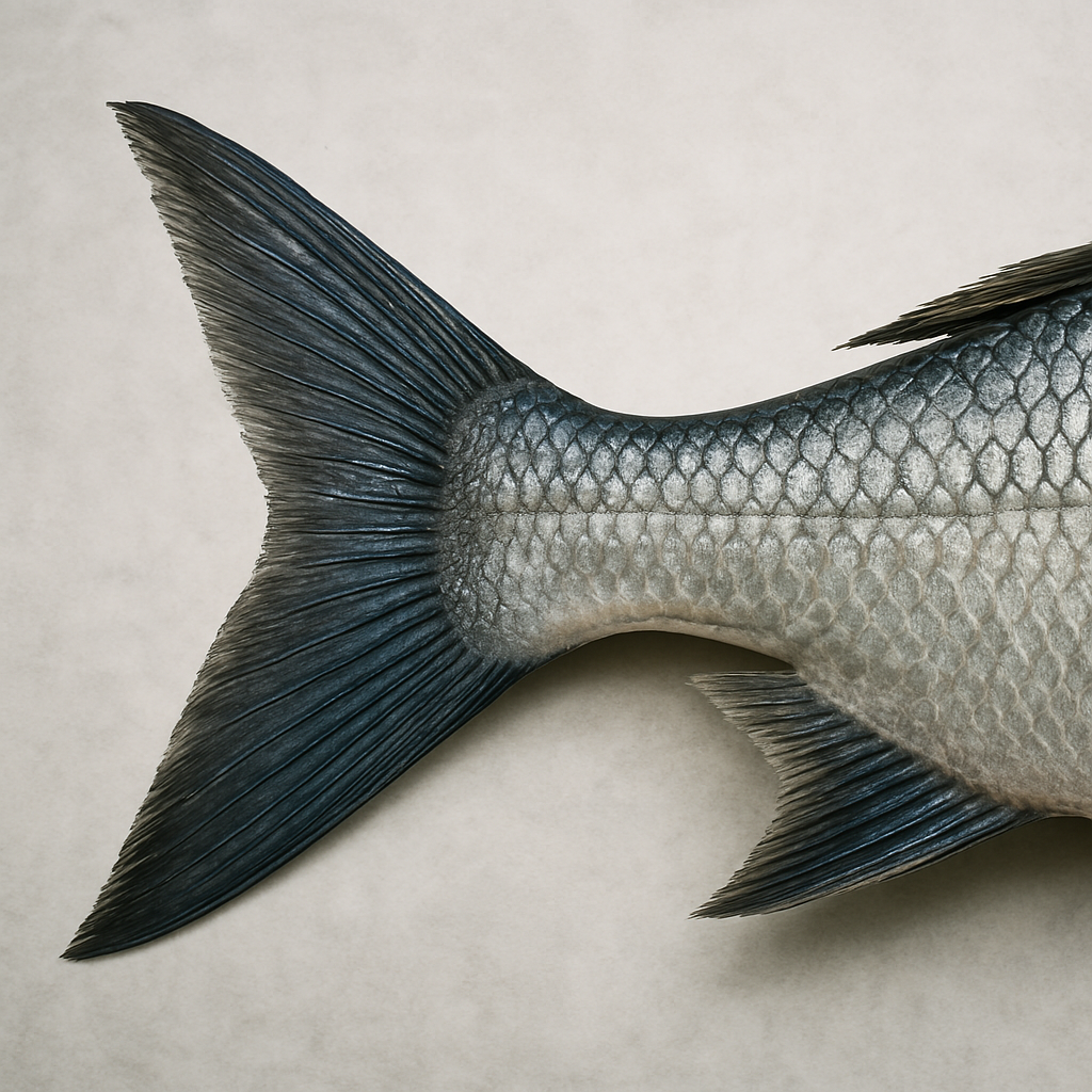Fish shape and anatomy helps us discover information about how a fish moves, where and how the fish lives, and how it has adapted to its environment. The shape of a fish's caudal fin indicates how the fish moves and lives as well. Pointed caudal fin like that in Catfishes and Sharks are effective in making thrust and variable speed and acceleration. They also use the pointed caudal fin to stun the prey. A rounded or truncated caudal fin like that in Killifish, Minnow, Snakehead, Trout, Salmon etc is good for maneuverability and short bursts of speed. This kind of caudal fin is commonly found on fishes living in coastal embankments, river mouths and riverine systems. A forked shaped caudal fin like that of Catla and Striped Bass is good for maneuverability and speed over longer distances. Lunate or crescent shaped caudal fin like those found in Tuna and Swordfish allow for great speed over long distances and are usually found on fish that live in the open system.