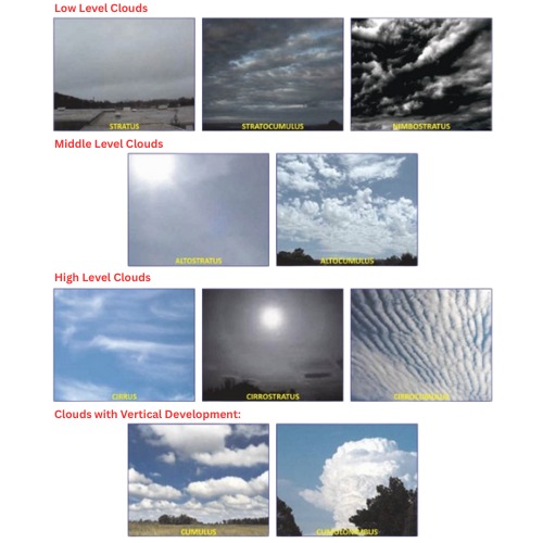 Clouds are classified according to their vertical distribution in the atmosphere from the ground as low level clouds, middle level clouds, high level clouds and clouds with vertical development. The vertical categories are further classified according to their composition and formations.