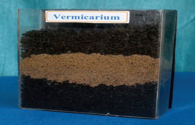 Vermicarium (wormery) is an artificial safe home for worms, like earthworms. The structure of vermicarium is a kind of container having variable height, width and length with its top open for transferring worms, soil, water and other required material into this. To see the activities of worms at least one side of the container is kept transparent. Through the transparent wall of vermicarium one can see the activities of worms, their burrowing style and pattern, feeding style, underground movement, excretion, interaction etc. Since worms avoid light, the vermicarium needs to be kept either covered or at a dark place so that worms are not forced to hide and they can perform activities naturally.